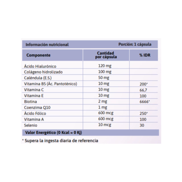 Suplemento dietario en cápsulas a base de colágeno, caléndula, ácido hialurónico, coenzima Q10, selenio, vitamina B5, biotina, vitamina A, Vitamina E, vitamina C y ácido fólico.