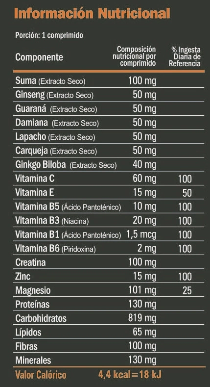Suplemento dietario a base de Suma,Ginseng, Guaraná, Damiana, Lapacho, Carqueja, Ginkgo Biloba, Vitamina C, Vitamina E, Acido Pantotenico, Niacina, Tiamina, Piridoxina, Monohidrato de Creatina, Zinc y Magnesio.