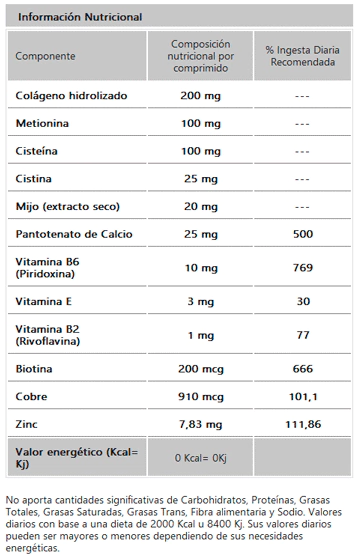 Cada comprimido contiene: Colágeno hidrolizado 200mg, Metionina 100mg, Cisteína 100mg, Cistina 25mg, Mijo (extracto seco) 20mg, Pantotenato de Calcio 25mg, Vitamina B6 (Piridoxina) 10mg, Vitamina E 3mg , Vitamina B2 (Rivoflavina) 1mg , Biotina 200mcg, Cobre 910mcg, Zinc 7.83mg.